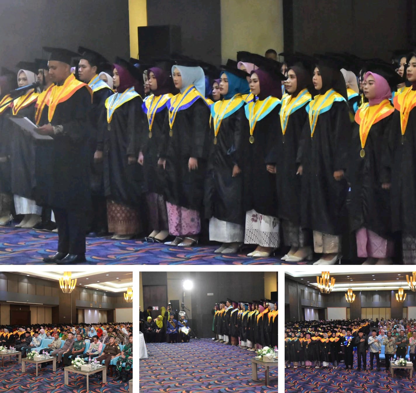 Acara berlangsung khidmat dan meriah, ditandai dengan prosesi pengalungan medali, penyerahan ijazah, serta ucapan selamat dari para pejabat dan keluarga wisudawan.