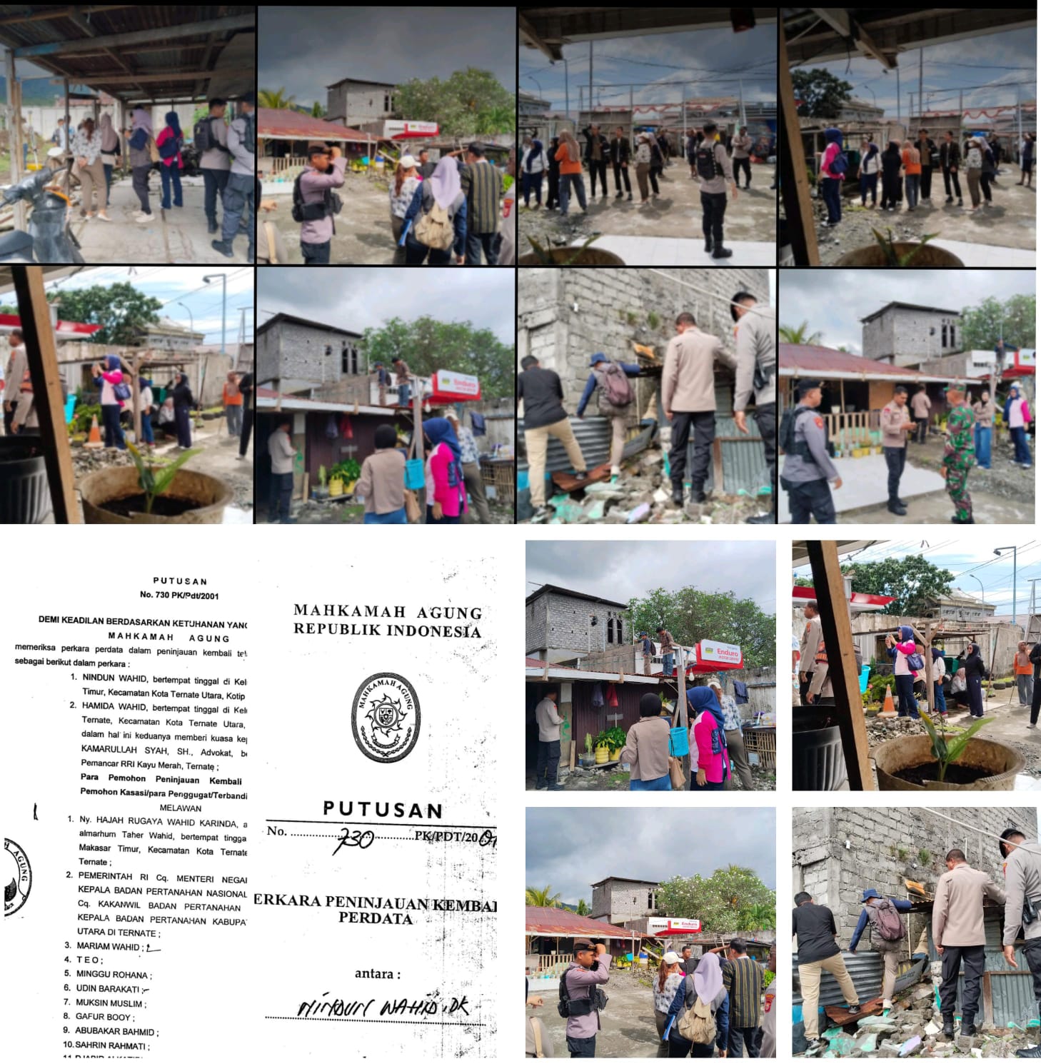 Berita Acara Pelaksanaan Eksekusi Pengosongan Nomor 1/Pdt. Eks/2023/PN Tte., Jo Nomor 1/Pen.Pdt/Constatering/2023/PN Tte., Jo.Nomor 1/Pdt. Aan/2023/PN Tte., Jo.Nomor 1/Pdt.G/1994/PN Tte. Jo.Nomor 90/PDT.G/1994/ PT MAL, Jo.Nomor 113 K/PDT/1995, Jo.Nomor 730 PK/PDT/2001, mencatat pelaksanaan eksekusi pengosongan pada 10 Juli 2023 yang melibatkan berbagai pihak, termasuk kepolisian, TNI, Satpol PP, BPN, dan Lurah Maliaro.
