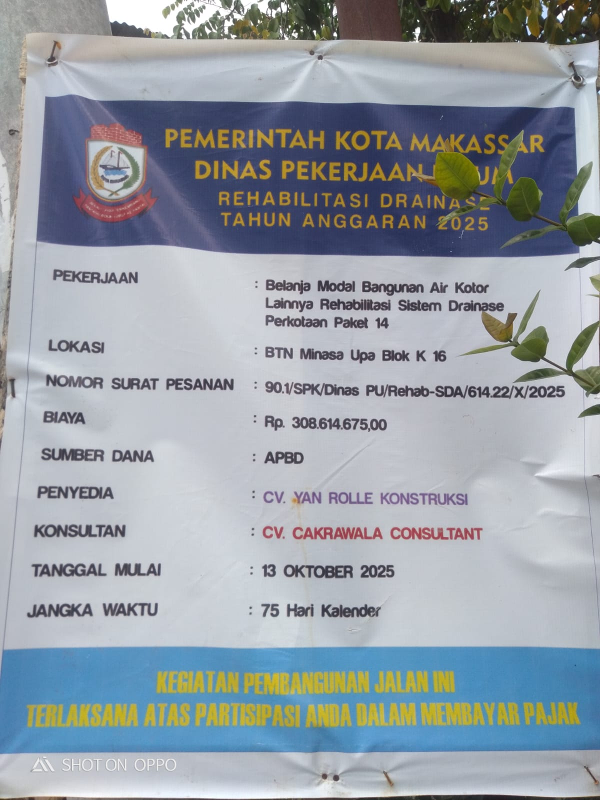 Kegiatan rehabilitasi tersebut mengacu pada program Belanja Modal Bangunan Air Kotor Lainnya – Rehabilitasi Sistem Drainase Perkotaan Paket 14 dengan total anggaran Rp 308.614.675 bersumber dari APBD Kota Makassar. Proyek dikerjakan oleh CV. Van Rolle Konstruksi dan diawasi CV. Cakrawala Consultant. Pekerjaan dimulai pada 13 Oktober 2025 dan ditargetkan selesai dalam 75 hari kalender.