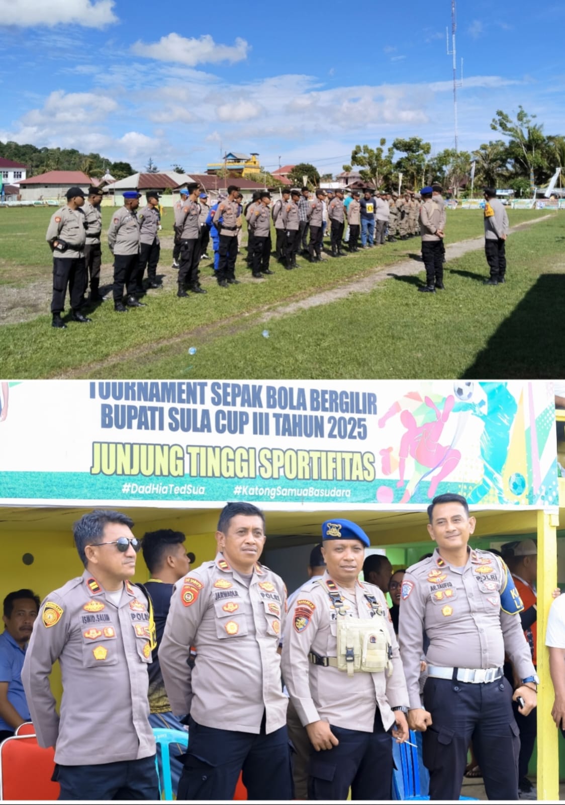 SANANA , Kepulauan Sula — Menjelang hari kedua babak perempat final turnamen sepak bola Piala Bupati Kepulauan Sula Cup III, pihak keamanan meningkatkan penjagaan dan pengamanan di seluruh area pertandingan. Langkah ini dilakukan guna memastikan seluruh rangkaian turnamen berjalan aman, tertib, dan kondusif di tengah tingginya antusiasme masyarakat.