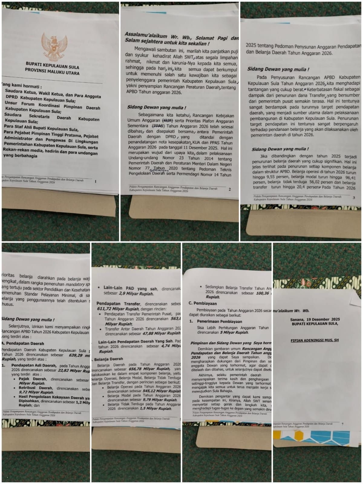 Wakil Bupati Kepulauan Sula, Ir. Hi. Saleh Marasabessy, M.Si, menyampaikan bahwa penyusunan APBD 2026 menghadapi tantangan berat akibat keterbatasan fiskal dan penurunan dana transfer dari pemerintah pusat. Hal ini berdampak pada penurunan target pendapatan daerah, yang menjadi sumber utama pembangunan di Kabupaten Kepulauan Sula.