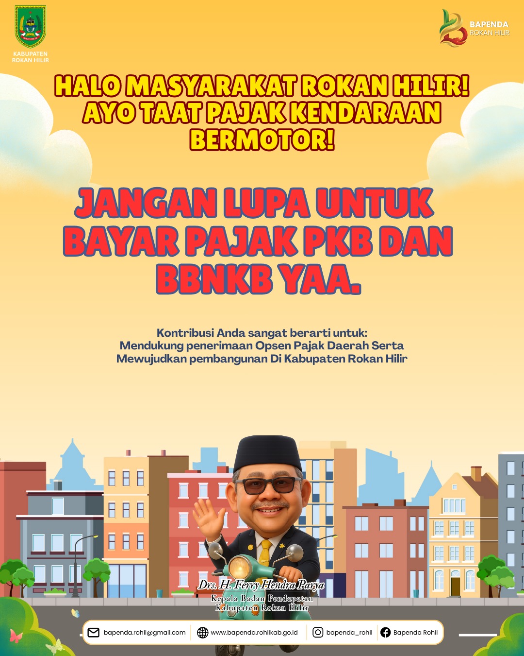 Rokan Hilir ( jendelanewsttv.com ) Badan Pendapatan Daerah (Bapenda) Kabupaten Rokan Hilir terus mengajak seluruh masyarakat untuk meningkatkan kesadaran dan kepatuhan dalam membayar pajak daerah tepat pada waktunya. Pajak yang dibayarkan masyarakat menjadi tulang punggung pendapatan daerah guna mendukung percepatan pembangunan dan peningkatan pelayanan publik.