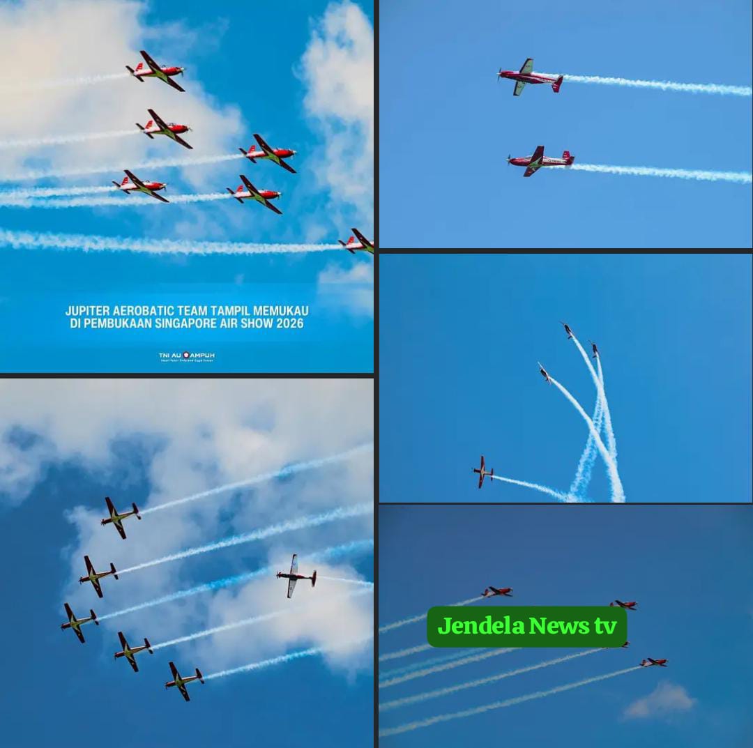 SINGAPURA ( jendelanewstv.com ), Jupiter Aerobatic Team (JAT) TNI Angkatan Udara kembali mengharumkan nama Indonesia di kancah internasional dengan menampilkan aksi aerobatik memukau pada pembukaan Singapore Airshow (SAS) 2026 yang digelar di Changi Exhibition Centre, Singapura, Selasa (3/2/2026).