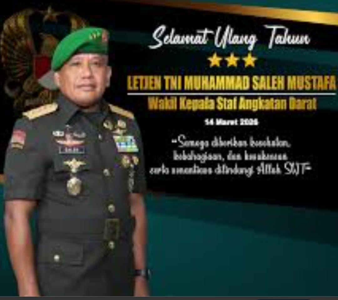 Ternate – Media Jendela News TV menyampaikan ucapan selamat ulang tahun ke-57 kepada Muhammad Saleh Mustafa, yang saat ini menjabat sebagai Wakil Kepala Staf TNI Angkatan Darat (Wakasad), tepat pada 14 Maret 2026. Jenderal bintang tiga tersebut merupakan putra daerah asal Ternate, Maluku Utara, yang lahir pada 14 Maret 1969.
